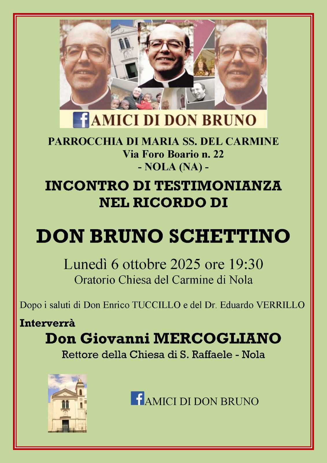 Per ricordare monsignor Schettino, lunedì 6 ottobre, presso l'Oratorio parrocchiale, alle 19:30, dopo i saluti del parrocco della comunità Maria Santissima del Carmine, don Enrico Tuccillo e di Eduardo Verrillo, interverrà il rettore della chiesa di San Raffaele in Nola, don Giovanni Mercogliano.