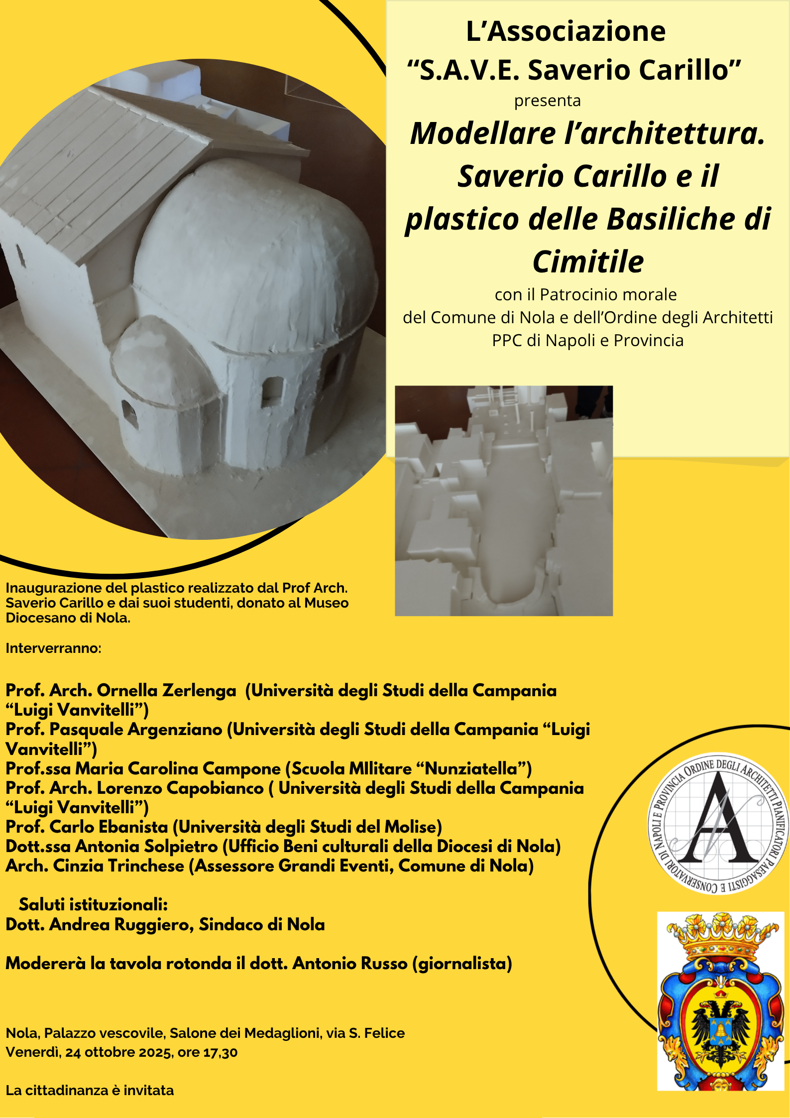 Venerdì 24 ottobre 2025, alle ore 17:30, nel Salone dei Medaglioni del Palazzo vescovile di Nola, si terrà il Convegno “Saverio Carillo e il plastico delle Basiliche di Cimitile”, promosso dall’Associazione “S.A.V.E. Saverio Carillo”.