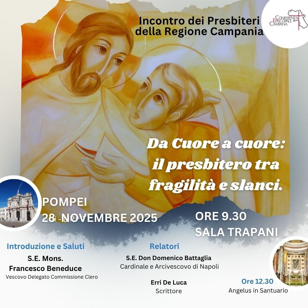 “Da Cuore a cuore: il presbitero tra fragilità e slanci” è il tema dell’appuntamento che riunirà i presbiteri della Campania per una giornata di ascolto, riflessione e fraternità. L’incontro si terrà presso il Santuario di Pompei, nella Sala Trapani, con inizio fissato per le 9:30.
