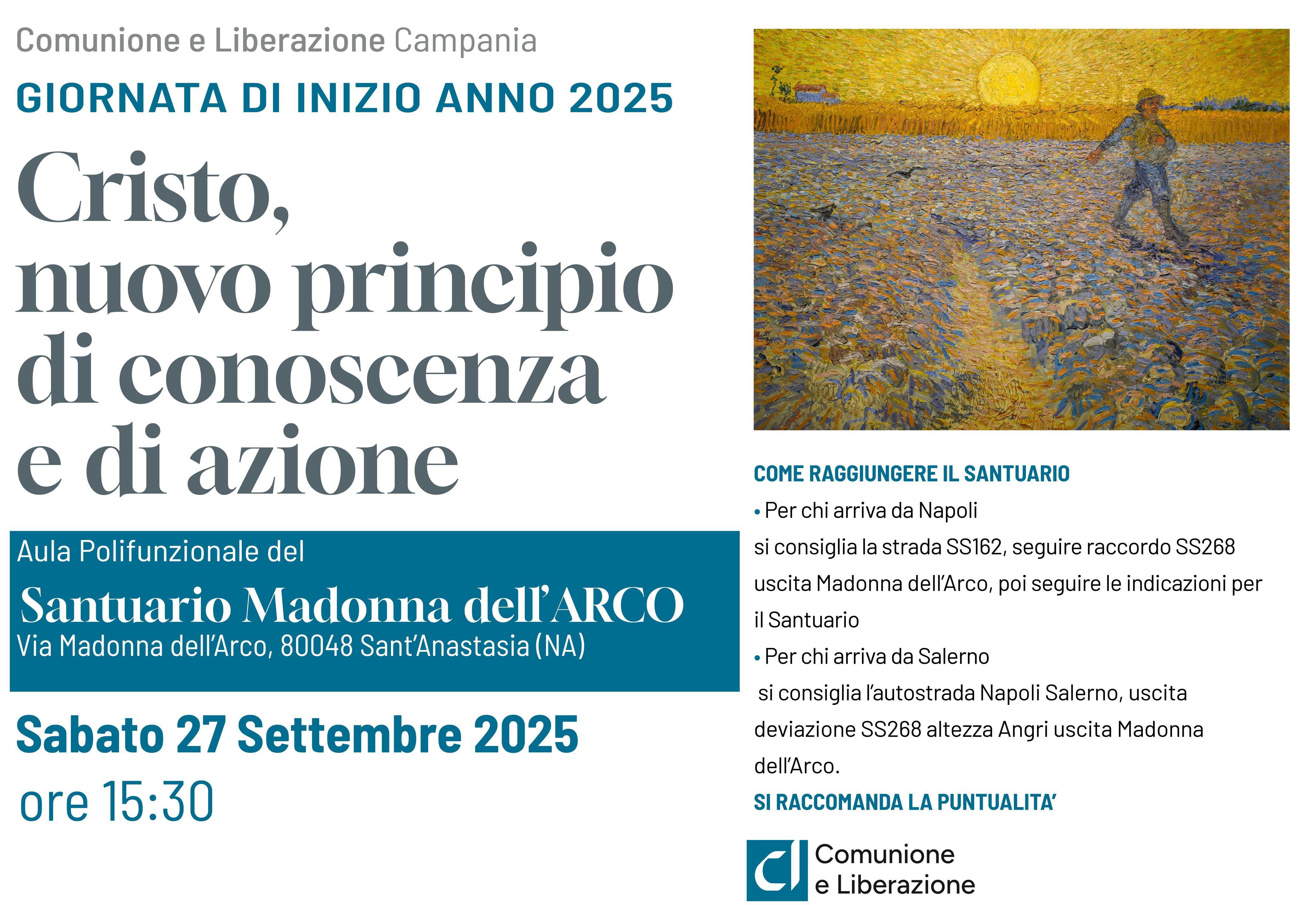 Il percorso di formazione, di approfondimento e, quindi, di annuncio per gli aderenti al Movimento ecclesiale di Comunione e Liberazione (Cl) vive una tappa fondamentale: la Giornata di inizio anno (Gia) che si svolge in tutte le Regioni d’Italia con un tema comune. Quest'anno la tematica scelta per la riflessione è "Cristo, nuovo principio di conoscenza e azione". L’Assemblea in Campania si terrà, per la prima volta, nella diocesi di Nola, presso il Santuario di Madonna dell’Arco, sabato 27 settembre, a partire dalle 15,30.