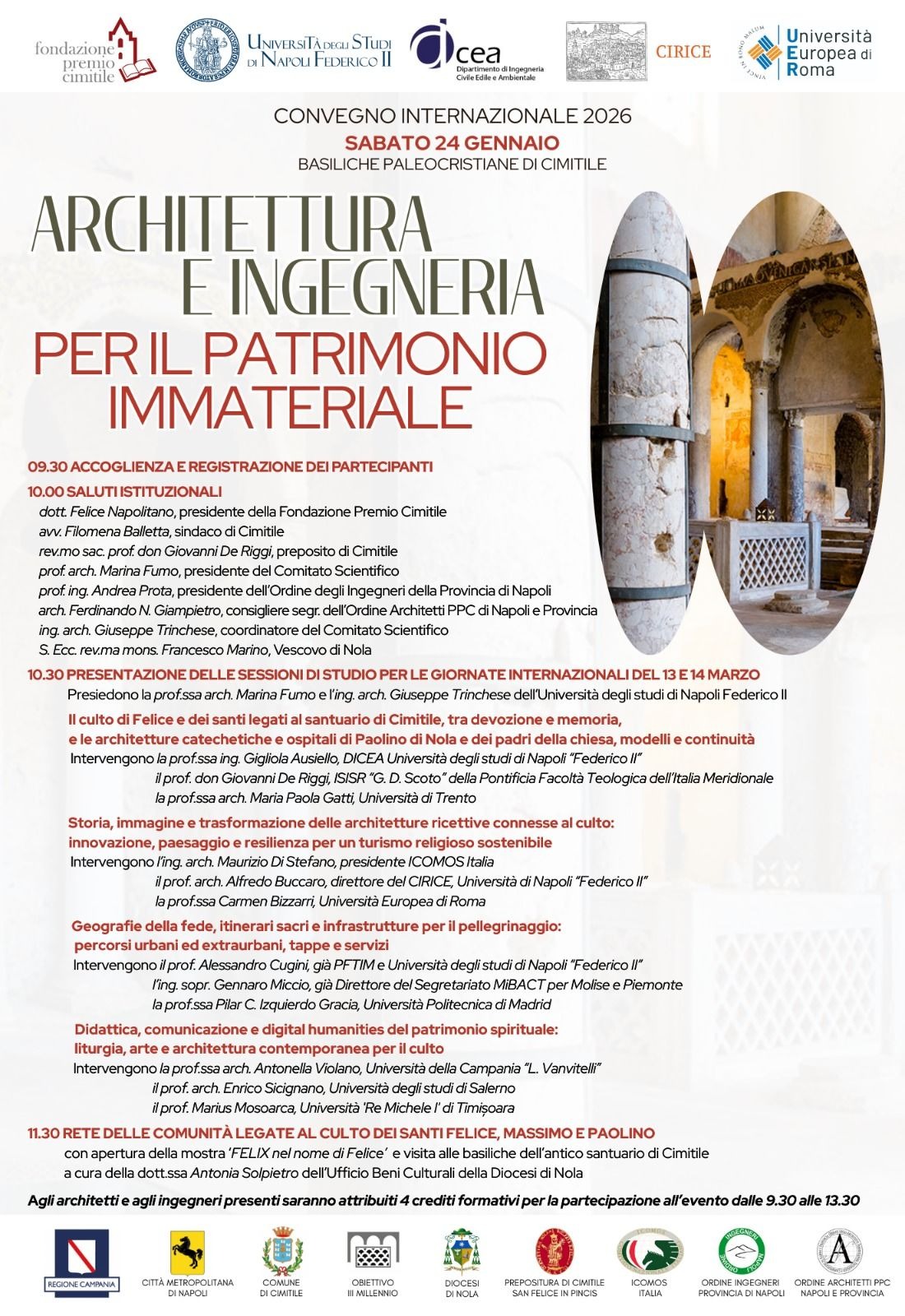 Domani, sabato 24 gennaio 2026 alle 10:00, nel contesto di eccezionale valore culturale del Complesso delle Basiliche Paleocristiane di Cimitile, si terrà l'incontro internazionale di apertura e presentazione delle Giornate internazionali di studio previste per il 13 e 14 marzo 2026 sul tema “Architettura e Ingegneria per il Patrimonio Immateriale”. L’iniziativa è promossa dalla Fondazione Premio Cimitile e dall’Università degli Studi di Napoli “Federico II”, in collaborazione con l’Università Europea di Roma, il Consiglio Internazionale dei Monumenti e dei Siti, il Comune di Cimitile, la diocesi di Nola e la Prepositura di Cimitile, con il patrocinio degli Ordini professionali degli Architetti e degli Ingegneri di Napoli.