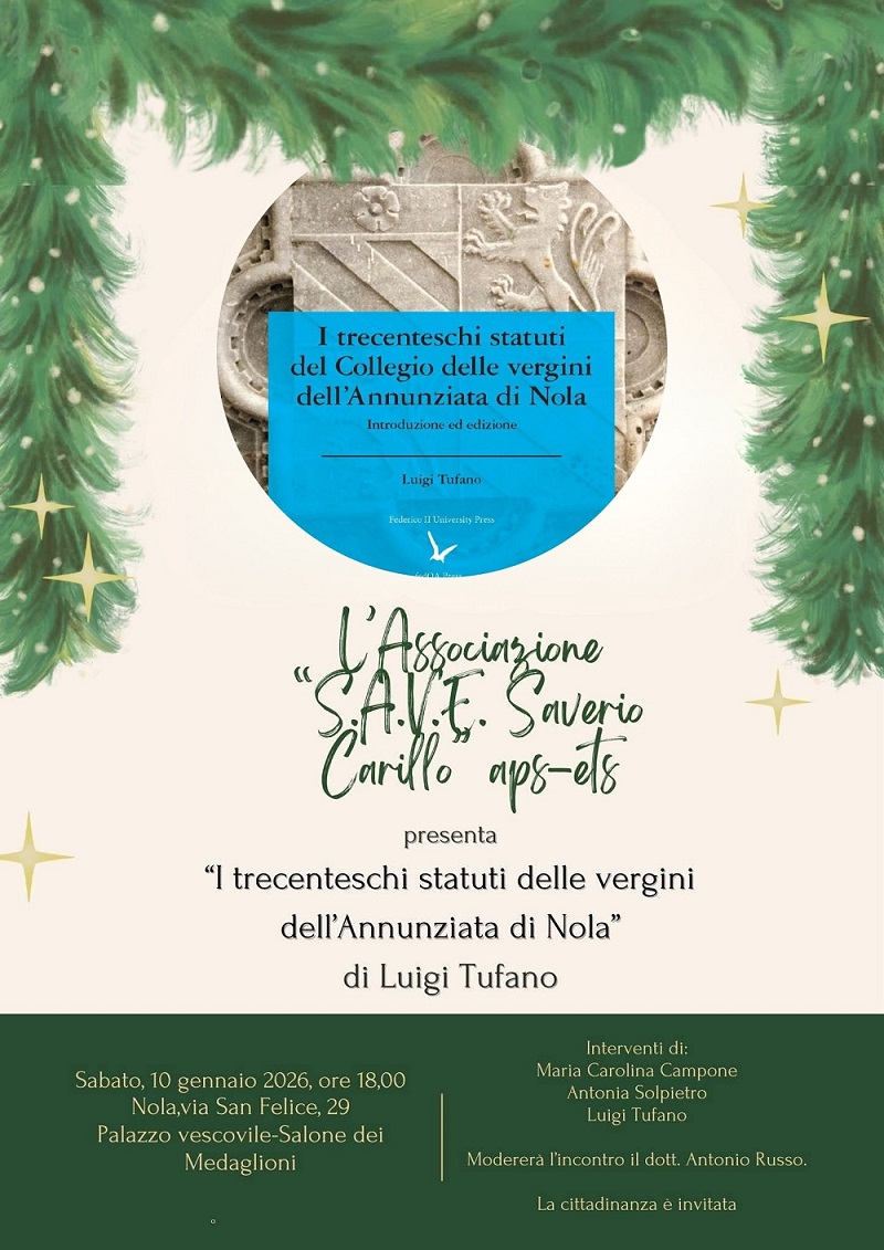 Sabato 10 gennaio 2026, alle 18:00, nel Salone dei Medaglioni annesso al Museo diocesano di Nola, l’Associazione “S.A.V.E. Saverio Carillo” presenterà il libro “I trecenteschi statuti del Collegio delle vergini dell’Annunziata di Nola” di Luigi Tufano. L’autore, docente di Storia medievale presso l’Università L’Orientale di Napoli, ripercorre in questo volume le vicende del Collegio delle vergini dell’Annunziata di Nola, un luogo di formazione religiosa e controllo sociale sulle giovani fanciulle dell’élite locale, fondato nel 1393 dal conte Nicola Orsini.