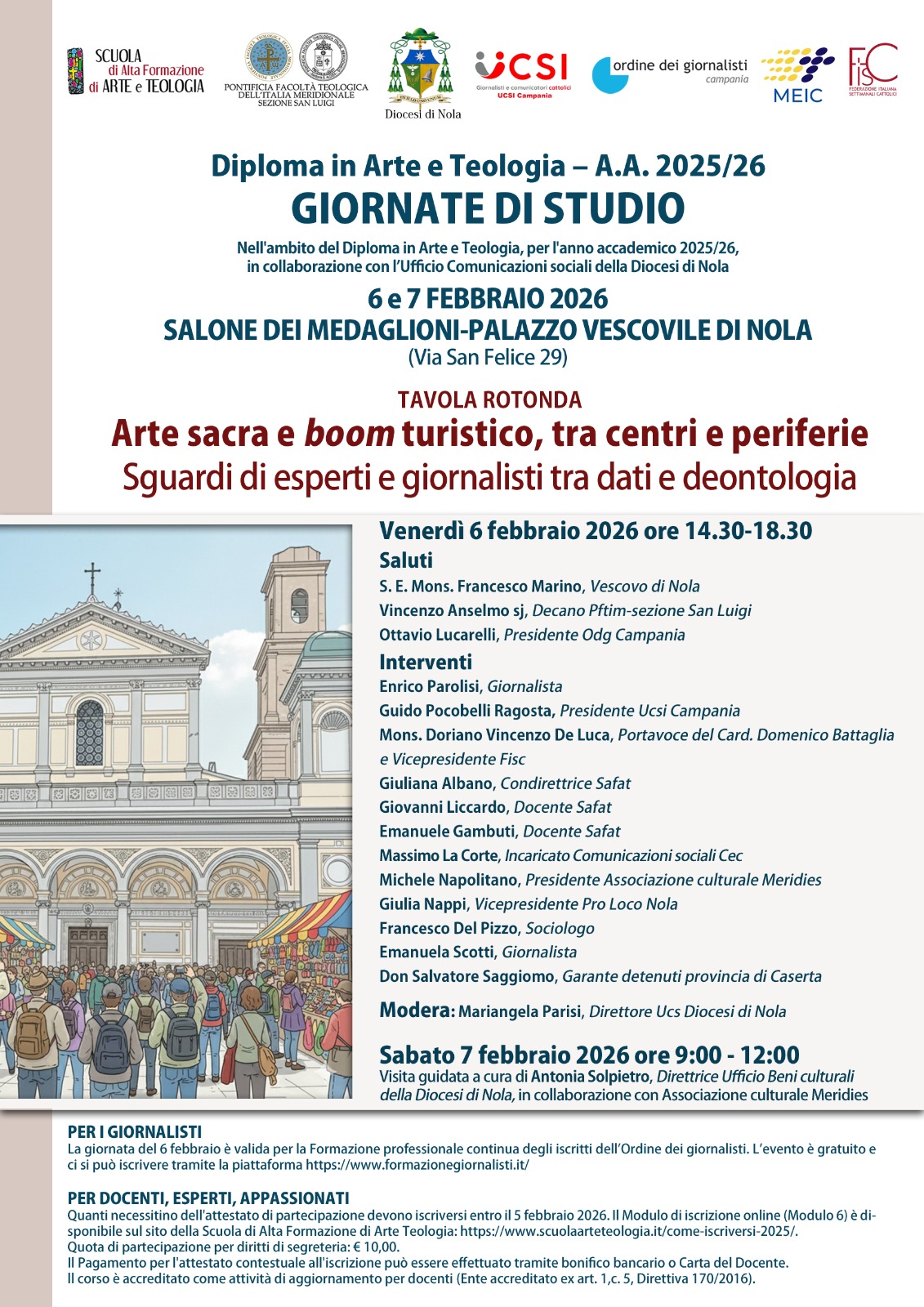 La mattina seguente, sabato 7 febbraio, dalle 9:00 alle 12:00, è in programma una visita guidata a cura di Antonia Solpietro, direttrice ufficio Beni culturali della diocesi di Nola, in collaborazione con l’associazione Meridies. Il corso è accreditato come attività di aggiornamento dei docenti ed è valido per la formazione professionale continua degli iscritti all’Ordine dei giornalisti.