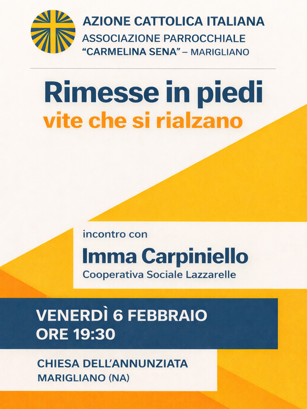 Si terrà alle 19:30 presso la chiesa dell'Annunziata il secondo incontro formativo con cui sicontinua il percoso di riflessioni e dibattiti promosso dall'Ac parrocchiale di Marigliano.«Non è uno slogan ottimistico né una promessa facile. È il riconoscimento che nella vita personale e collettiva esistono cadute reali, fallimenti, ferite profonde. E che rialzarsi non è mai un gesto solitario né automatico. “Rimettersi in piedi” significa attraversare una crisi, riconoscere ciò che si è spezzato e scoprire che può esistere una seconda possibilità. Spesso questo accade quando qualcuno ci guarda in modo diverso, quando un contesto non ci riduce all’errore, quando il lavoro, la fiducia, la relazione restituiscono dignità. Incontreremo una storia concreta che parla di tutto questo», ha dichiarato l'animatore del gruppo adulti di Ac, Pasquale Piccolo.