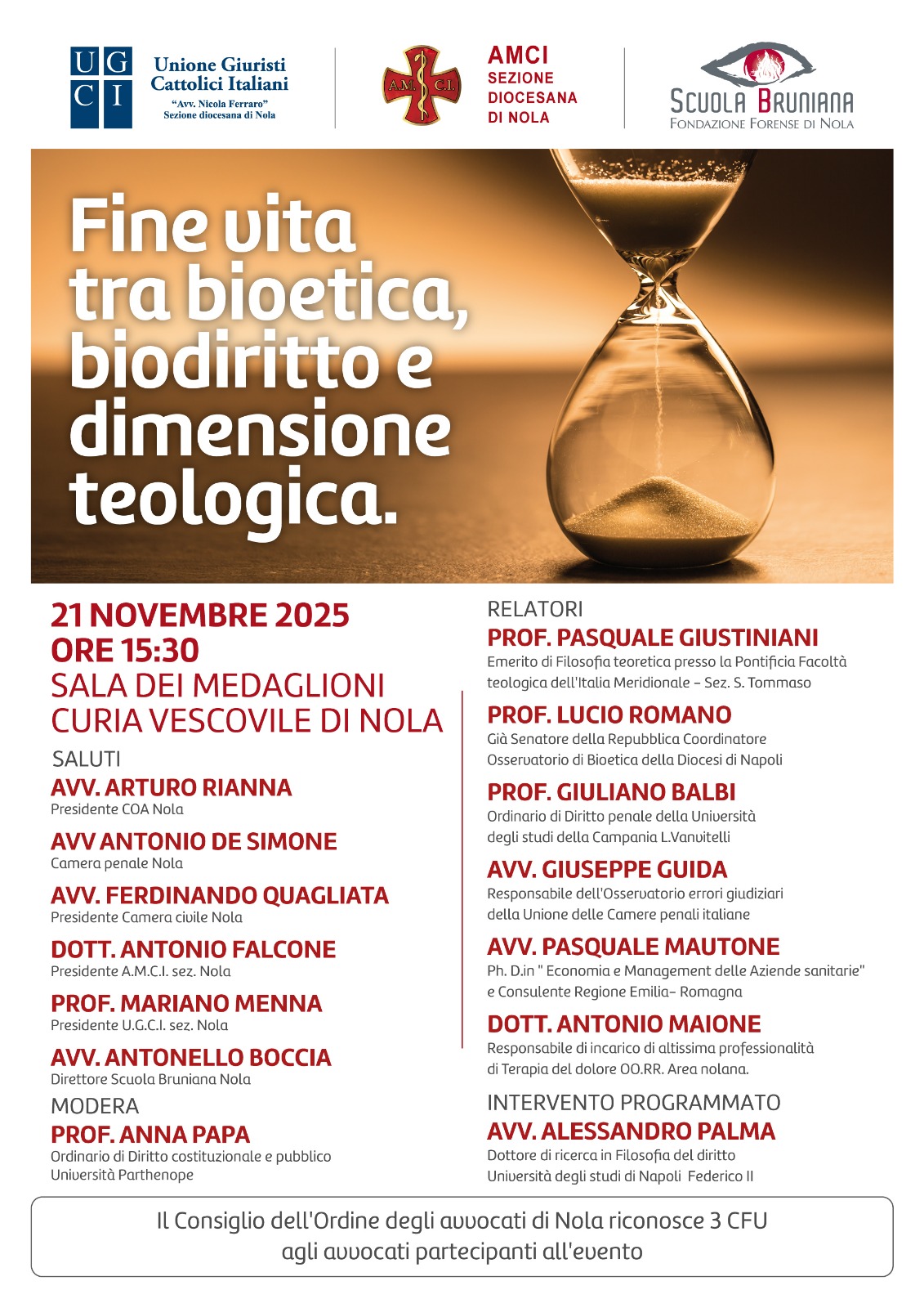 Si terrà il prossimo giovedì 21 novembre 2025, alle 15:30, presso la Sala dei Medaglioni della Curia Vescovile di Nola, un importante convegno di studio e approfondimento su un tema di stringente attualità: “Fine vita tra bioetica, biodiritto e dimensione teologica”. L'evento è organizzato congiuntamente dalle sezioni nolane dell'Unione giuristi cattolici italiani (Ugci) e dell'Associazione medici cattolici italiani (Amci), con la collaborazione della Scuola Bruniana - Fondazione Forense di Nola.