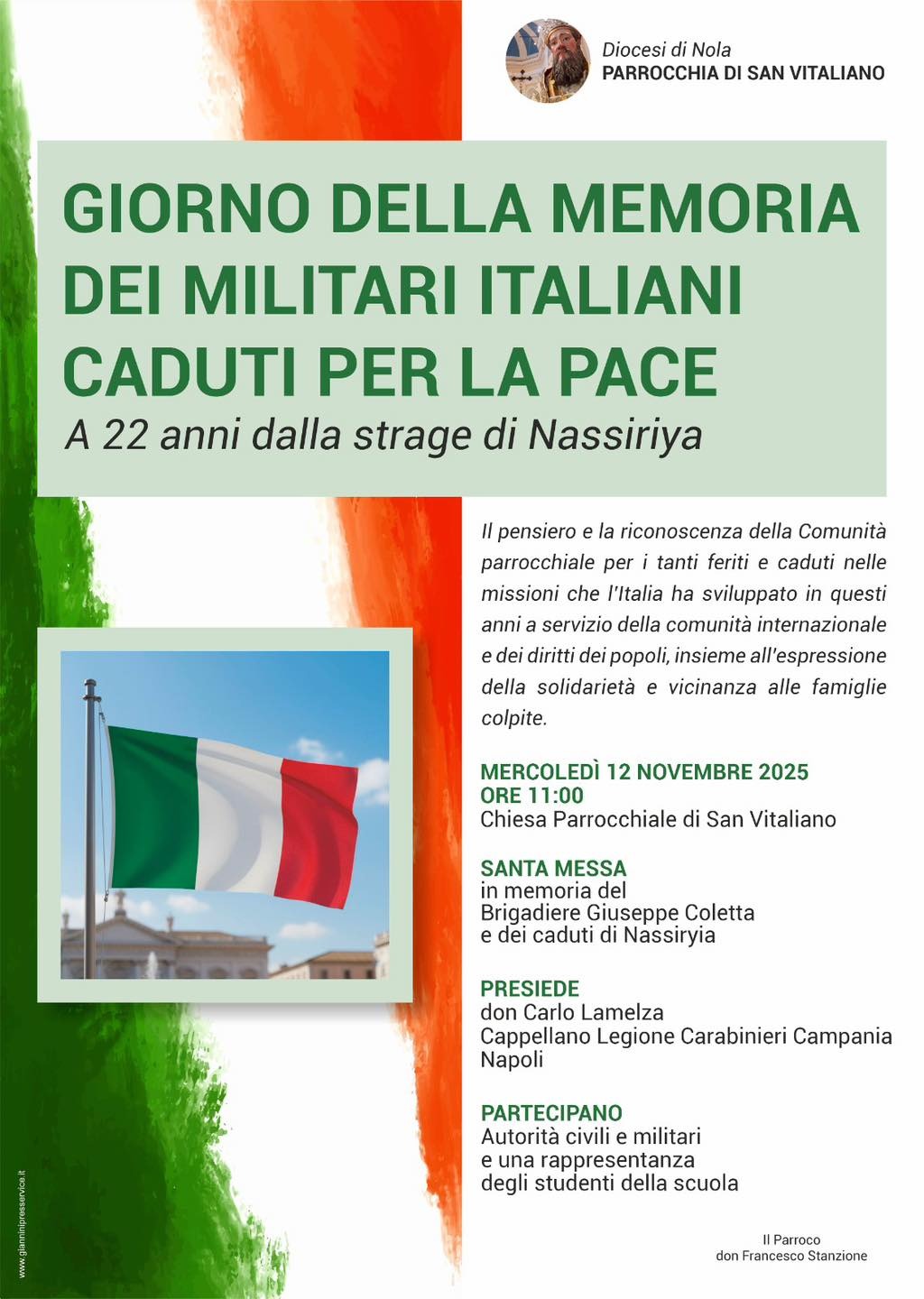 Questa mattina, mercoledì 12 novembre, alle 11:00, presso la chiesa parrocchiale di San Vitaliano si tiene una Santa Messa, presieduta dal Cappellano del Comando Legione Carabinieri Campania Napoli, don Carlo Lamelza in memoria del Brigadiere Giuseppe Coletta e dei caduti di Nassiriya. Partecipano alla Celebrazione eucaristica le autorità civili e militari insieme a una rappresentanza degli studenti delle scuole "Omodeo-Beethoven" di Scisciano e San Vitaliano e del "Liceo Colombo" di Marigliano. Il parroco della comunità Maria Santissima della Libera, don Francesco Stanzione ricorda in particolare il sanvitalianese di adozione, il Brigadiere Coletta.