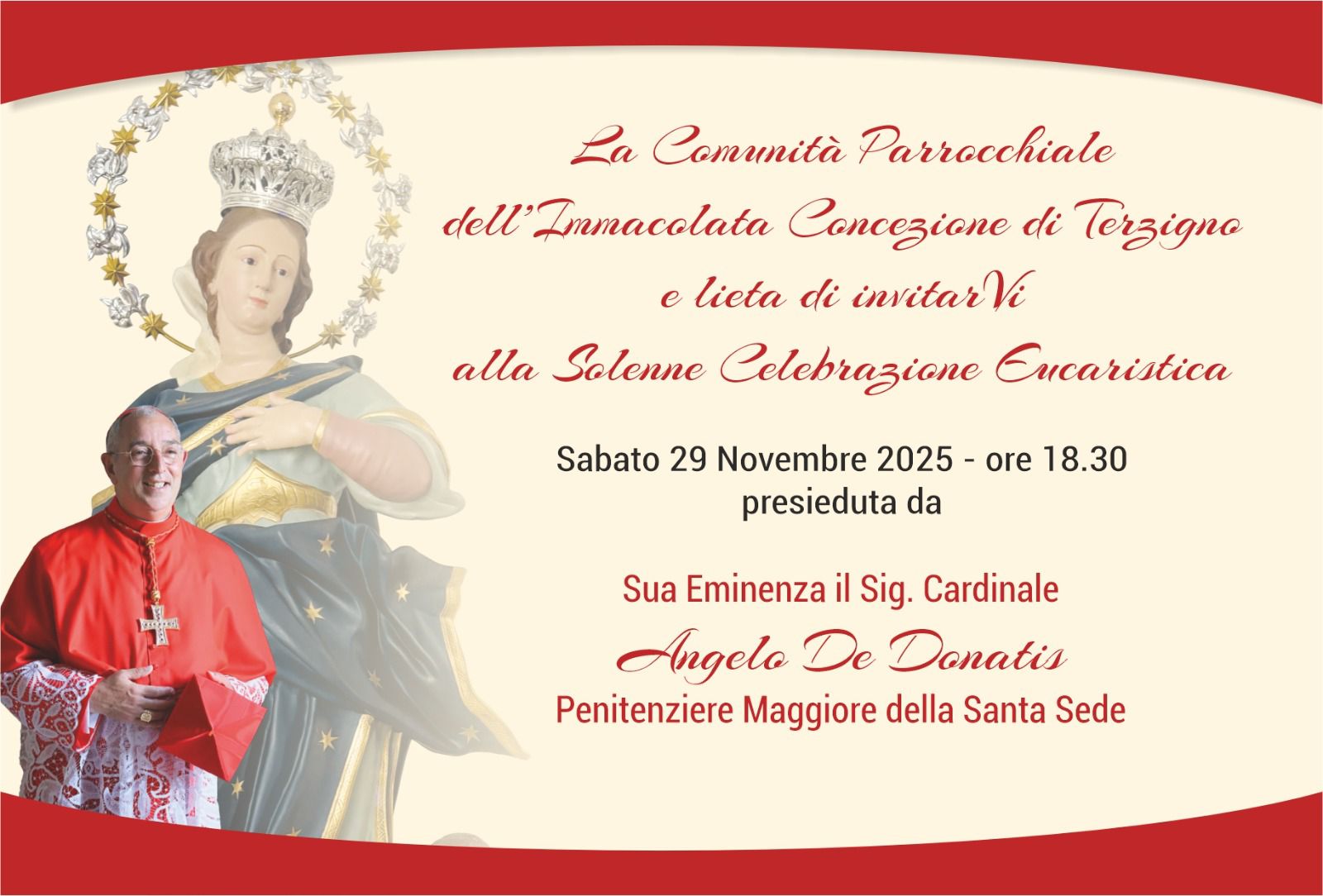 La comunità parrocchiale dell'Immacolata Concenzione di Terzigno, in occasione dell'inizio della Novena in preparazione all'8 dicembre, si ritroverà, sabato 29 novembre, per la Santa Messa presieduta dal Penitenziere Maggiore della Santa Sede, il cardinale Angelo De Donatis.