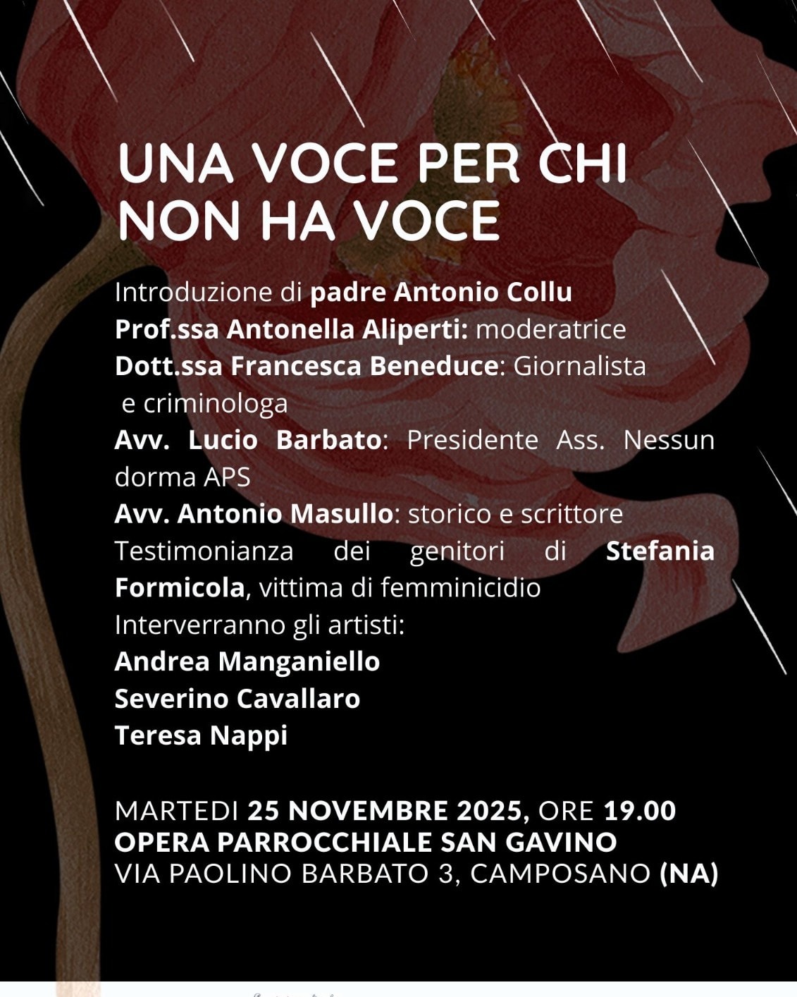 Ad intervenire saranno la giornalista e criminologa, Francesca Beneduce, il presidente dell'Associazione Nessuno dorma, Lucio Barbato, lo storico e scrittore Antonio Masullo. Durante la serata è prevista la testimonianza dei genitori di Stefania Formicola, vittima di femminicidio. Previsti anche gli interventi di tre artisti: Andrea Manganiello, Severino Cavallaro e Teresa Nappi.