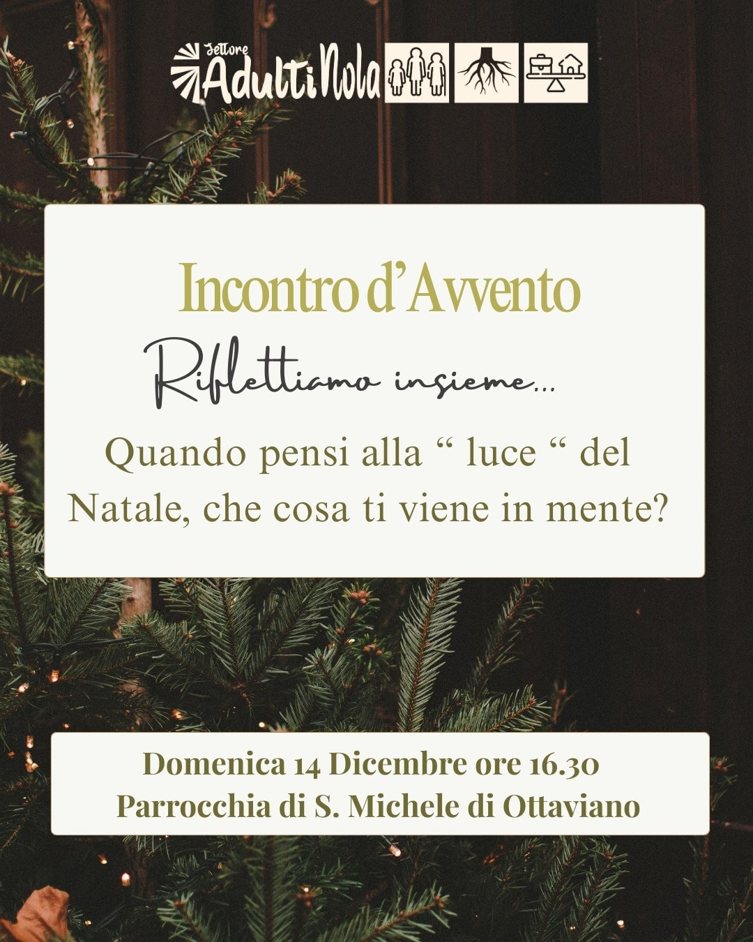 Si terrà domenica 14 dicembre 2025, alle ore 16:30, presso la parrocchia di San Michele Arcangelo a Ottaviano, il tradizionale pomeriggio di Avvento del Settore Adulti dell'Azione cattoca di Nola.