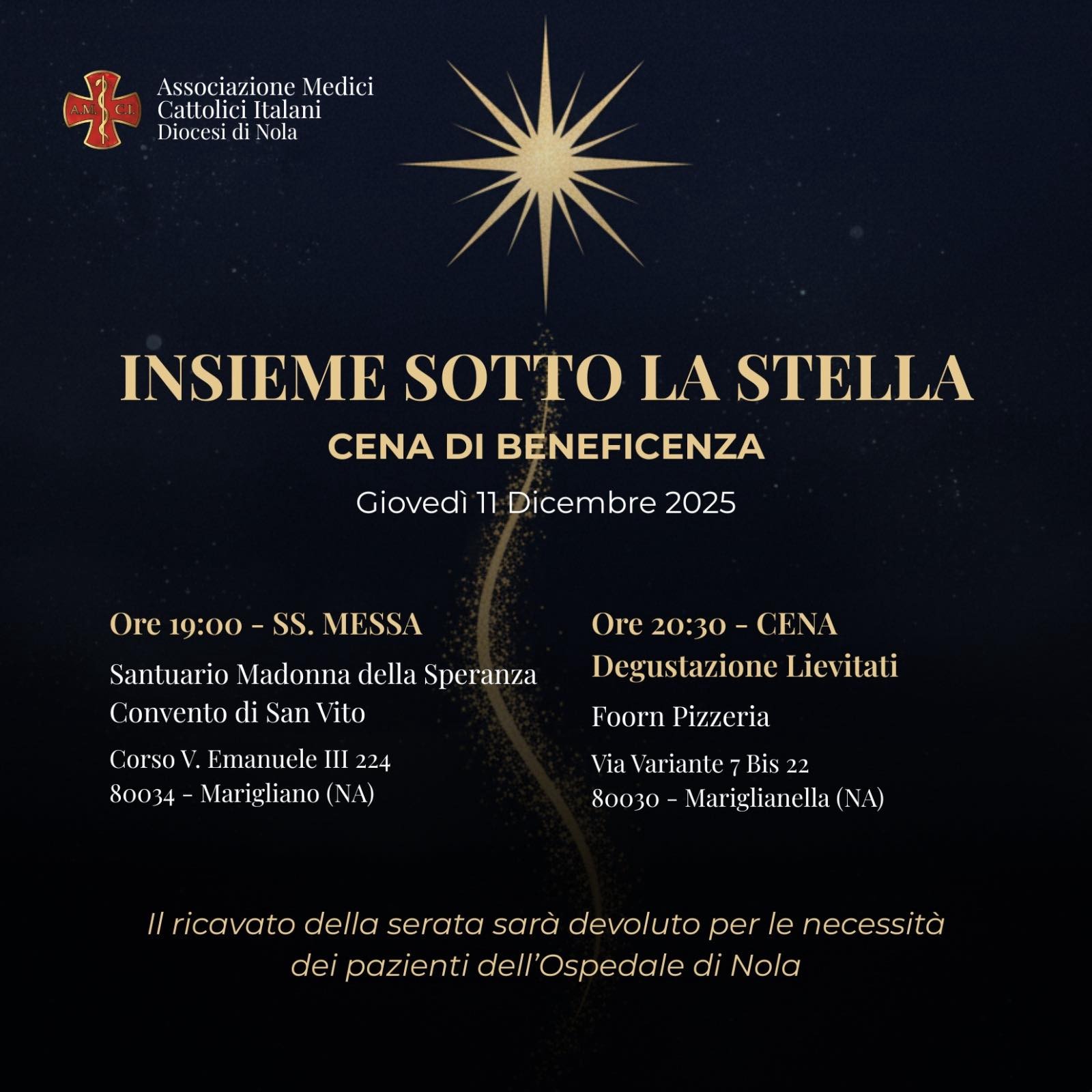 L'Associazione medici cattolici italiani (Amci) della diocesi di Nola promuove un evento di beneficenza dal titolo "Insieme sotto la Stella", una serata finalizzata alla raccolta fondi per le esigenze dei pazienti dell'Ospedale di Nola. L'appuntamento è fissato per giovedì 11 dicembre 2025. La serata si articolerà in due momenti distinti: alle 19:00 presso il Santuario Madonna della Speranza del Convento di San Vito è in programma la Santa Messa. A seguire, alle 20:30, ci sarà la cena con "Degustazione Lievitati" presso il Foorn Pizzeria in Mariglianella.
