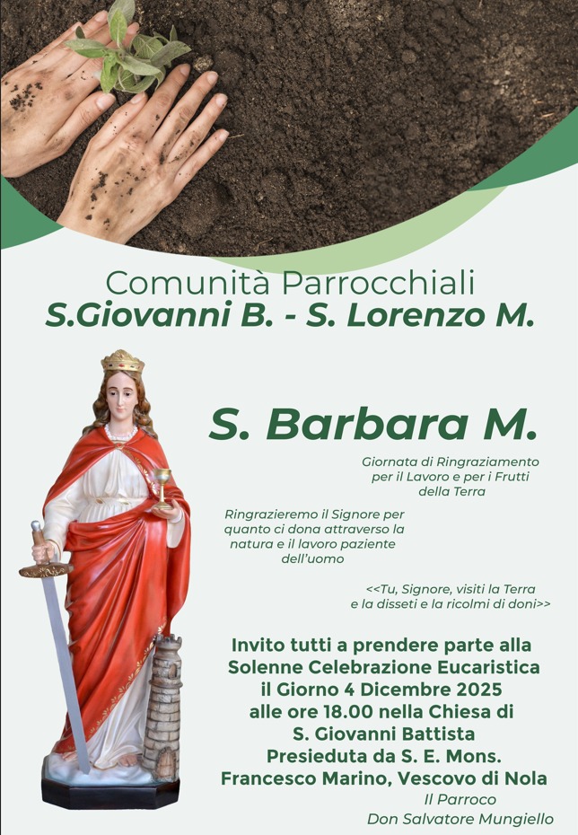 Domani, 4 dicembre, le comunità parrocchiali di San Giovanni Battista e San Lorenzo Martire di Ottaviano si ritroveranno per celebrare la memoria liturgica di santa Barbara vergine e martire, con una Celebrazione eucaristica presieduta dal vescovo di Nola, Francesco Marino. La Santa Messa, alle 18:00, presso la chiesa di San Giovanni Battista, sarà l'occasione anche per vivere la Giornata di Ringraziamento per il lavoro e per i frutti della Terra.